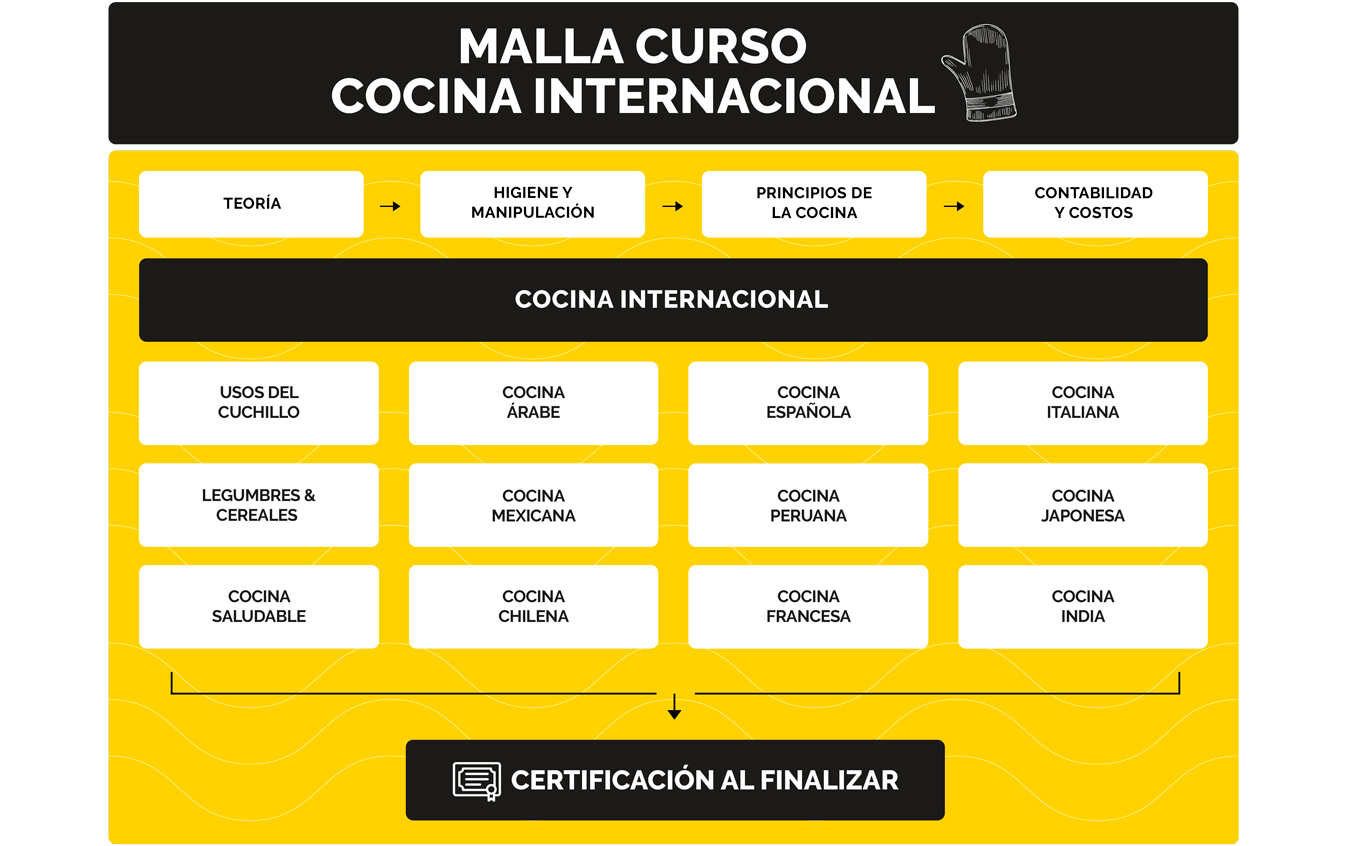Este curso es único y profesional ¡No pierdas la oportunidad de convertirte en un cocinero de alta categoría y con un gran conocimiento culinario internacional! Que luego podrás llevarlo a cabo en tu casa para ti, tus amigos y familia, pero también en caso que quisieras tener algún emprendimiento gastronómico.